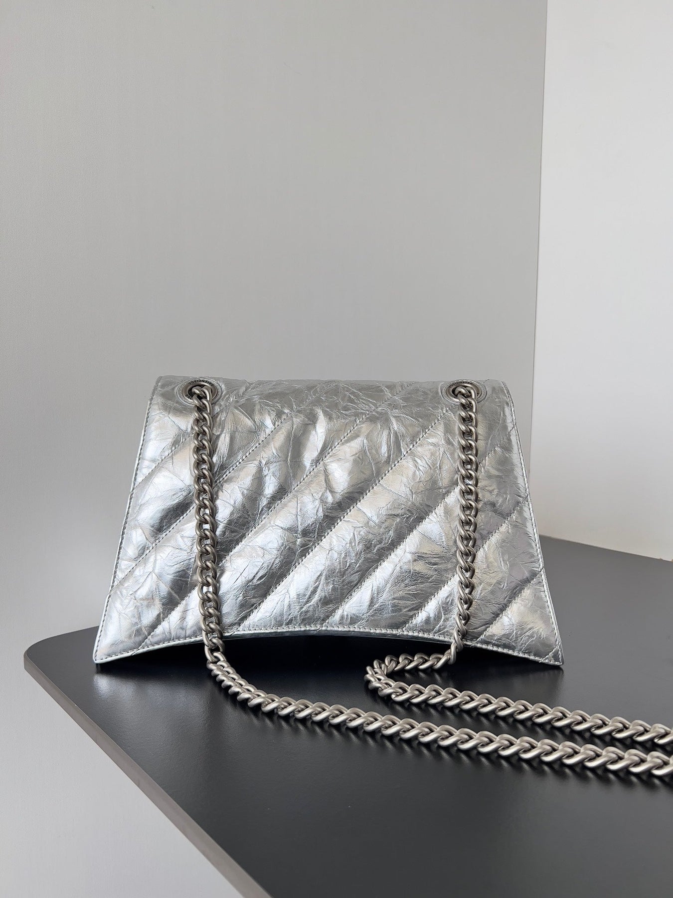 CRUSH CHAINED BAG 32 IN SILVER METALLIC QUILTED CRUSHED CALFSKIN