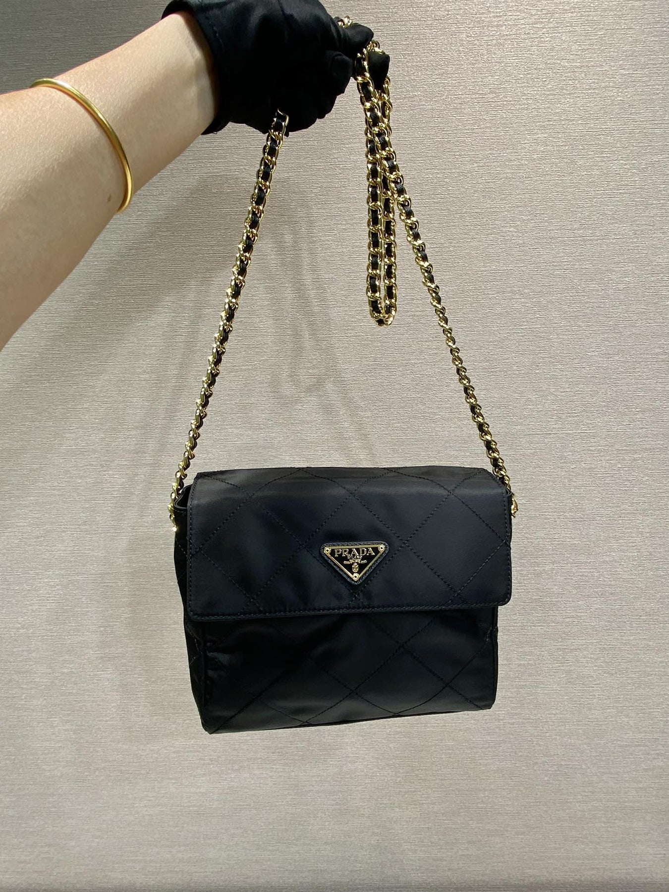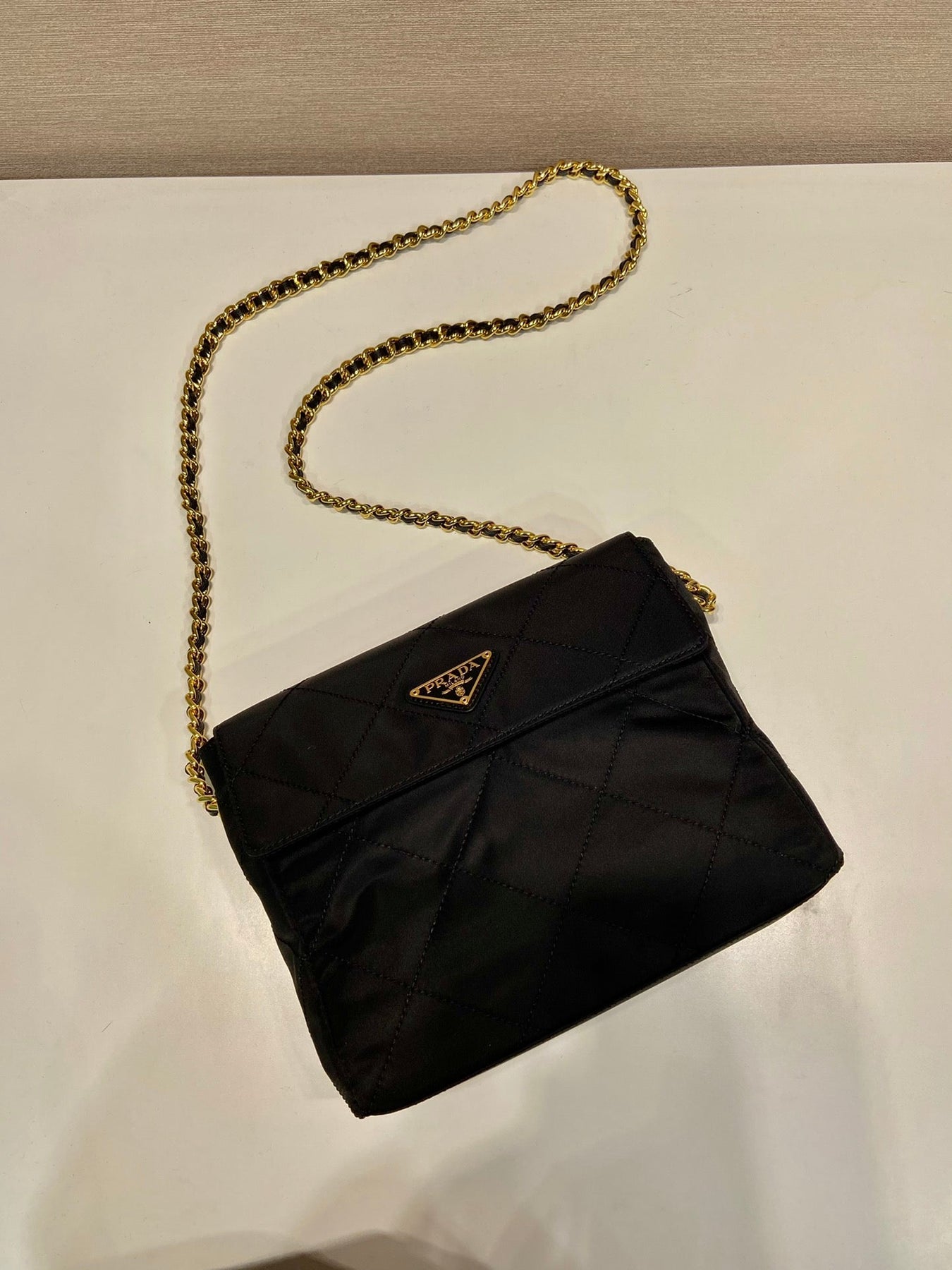large quilted flap bag 23 in black re-nylon fabric gold chain